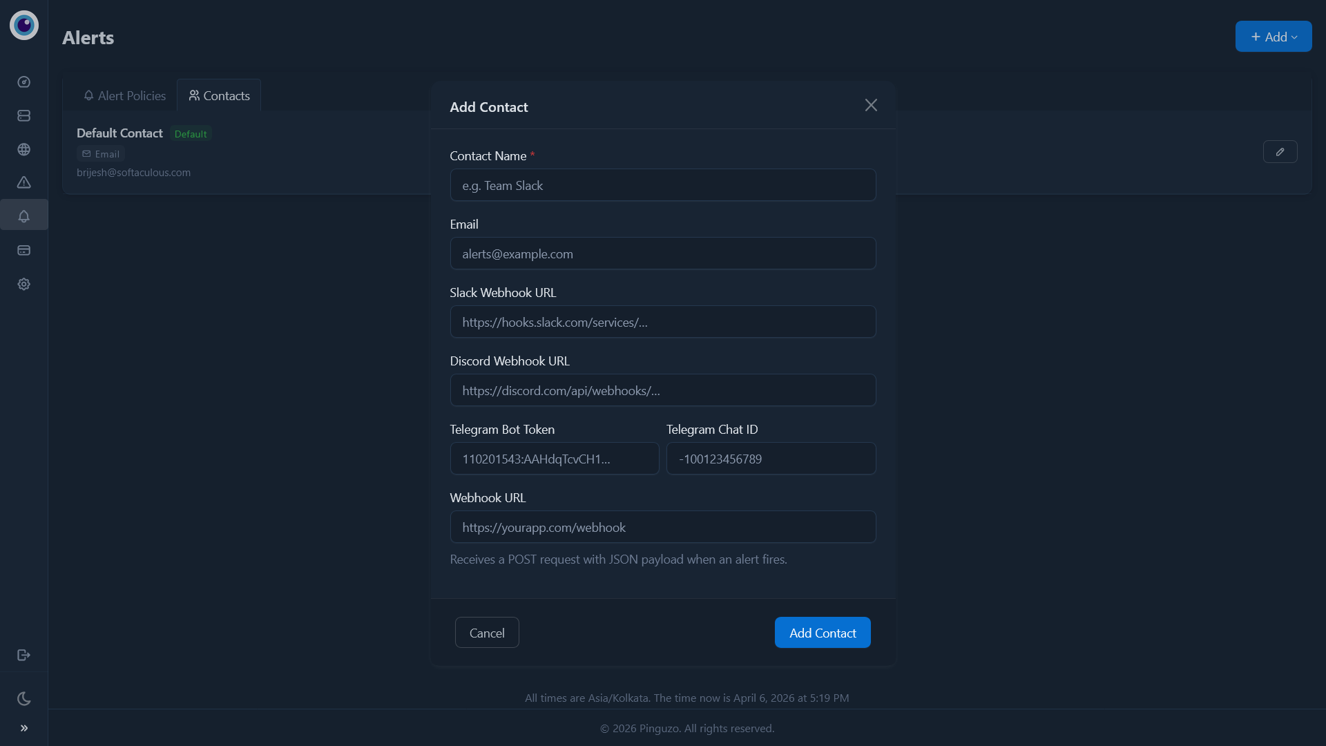 Receive instant alerts via Email, Slack, Discord, Telegram, Webhooks, and more.
