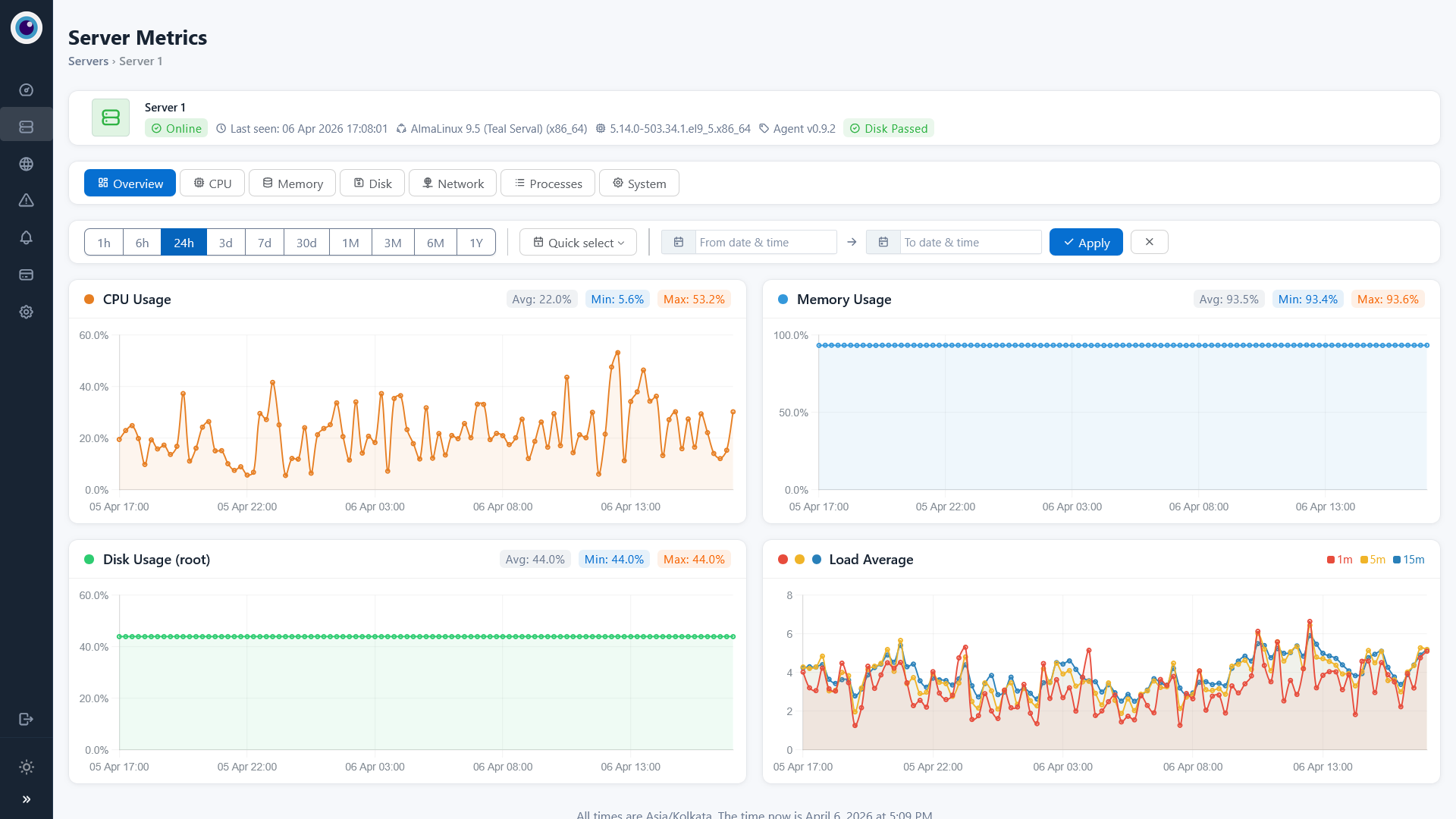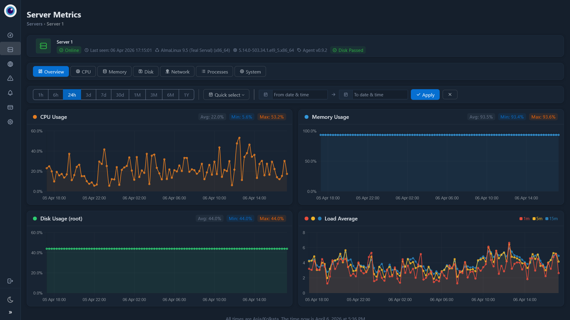 Monitor CPU, RAM, disk, network, and processes with minute-level precision.