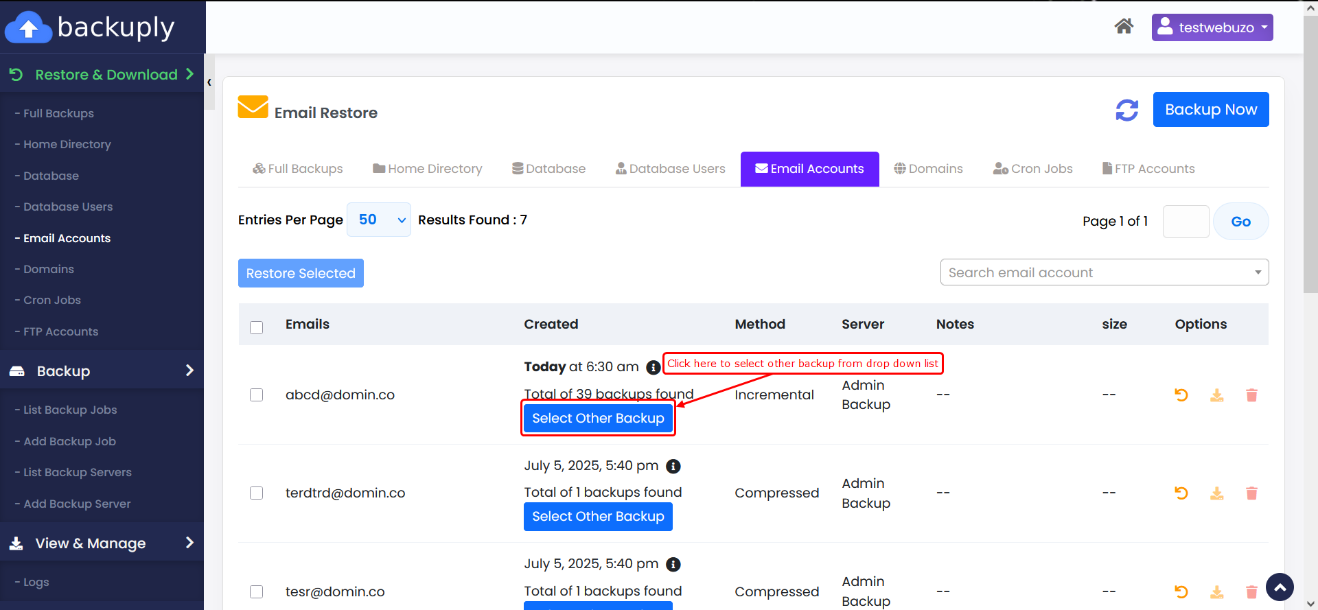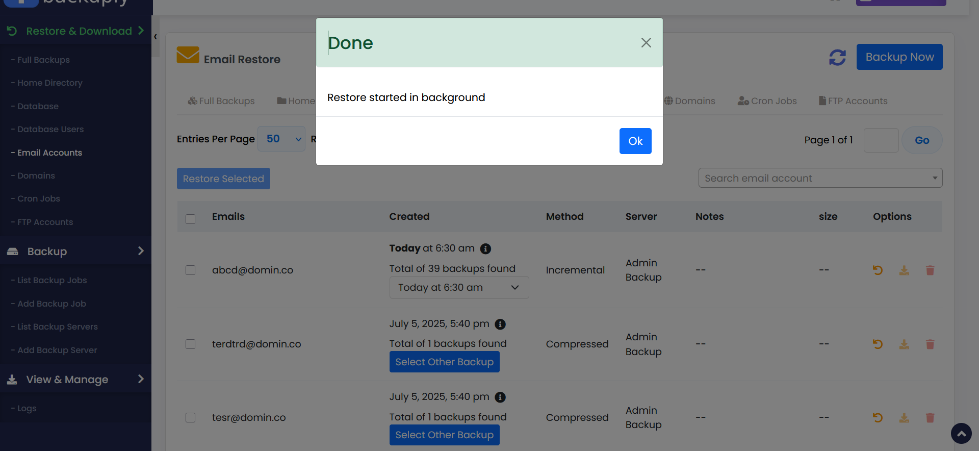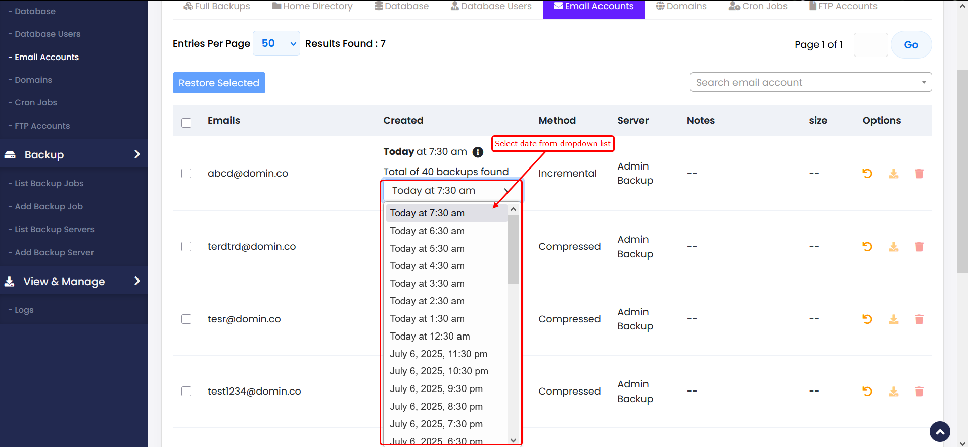 select the email account(s) you want to restore. Then, choose the backup date you wish to restore from, and click the Restore icon to begin the process.