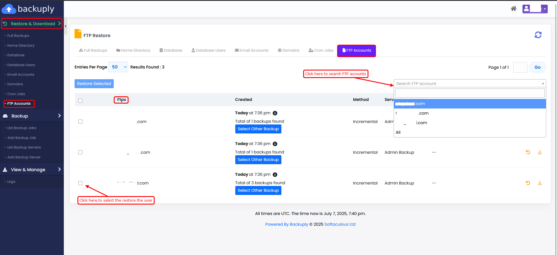 Navigate to the Backuply Enduser Panel > Restore & Download > FTP Accounts.