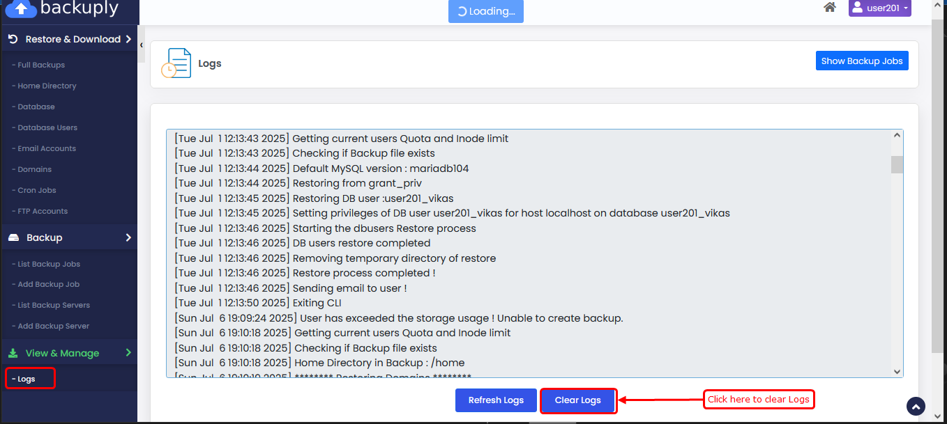 This guide will help you understand the Logs section, where you can see detailed records of all backup and restore activities. It helps you check which tasks were successful, which databases were created or restored, and review any errors.